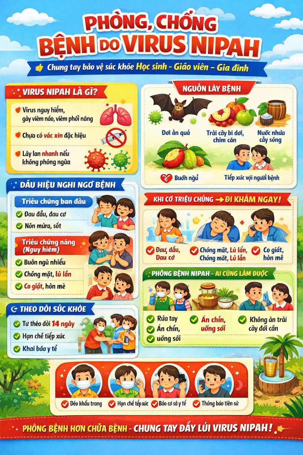 Hiện nay, Bộ Y tế đã có khuyến cáo về việc chủ động phòng, chống dịch bệnh do virus Nipah, một loại virus có khả năng lây truyền từ động vật sang người và gây ảnh hưởng nghiêm trọng đến sức khỏe. Để bảo vệ an toàn cho trẻ và cộng đồng, nhà trường rất mong phụ huynh phối hợp thực hiện tốt các biện pháp phòng dịch sau: