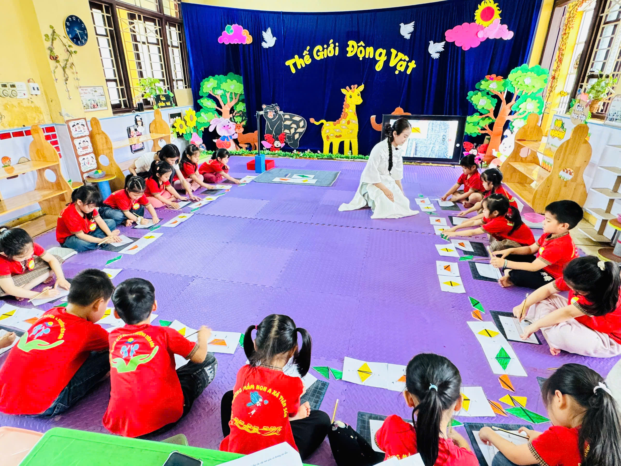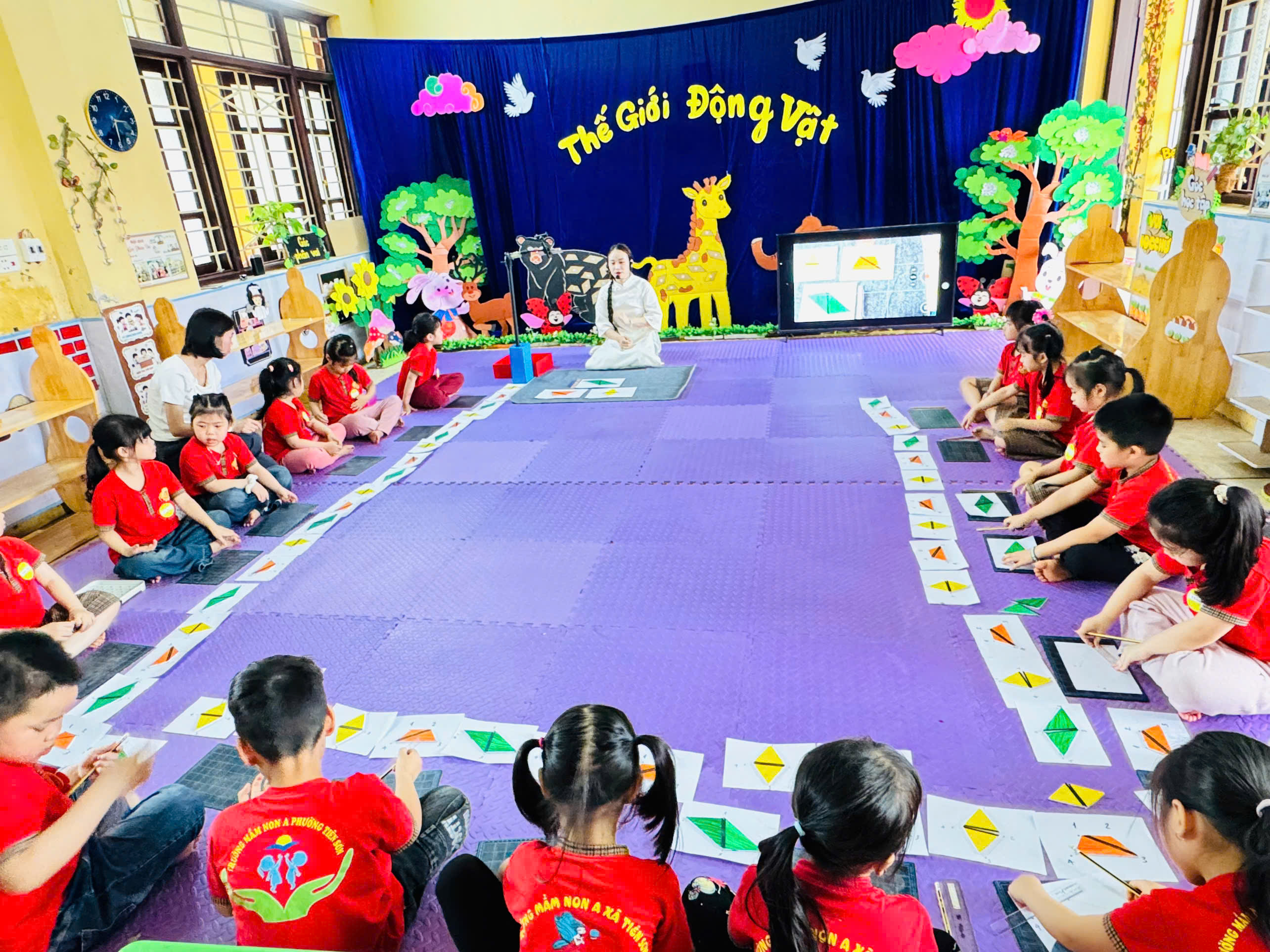 Ngay từ những phút đầu, tiết học đã tạo được sự cuốn hút đặc biệt nhờ cách tổ chức linh hoạt, nhẹ nhàng và đầy tinh tế. Với việc vận dụng phương pháp Montessori – đề cao sự chủ động, tự khám phá của trẻ – cô giáo đã khéo léo dẫn dắt trẻ bước vào thế giới của những hình tam giác đầy màu sắc và biến hóa. Không còn là những kiến thức khô khan, các hình học trở nên sống động khi trẻ được trực tiếp cầm, ghép, xoay chuyển và sáng tạo nên vô vàn hình dạng mới.